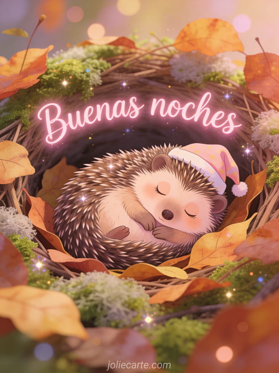 Envía una imagen tierna para desear buenas noches al amor de tu vida con esta adorable tarjeta gratis. Un dulce erizo con un gorrito de dormir acurrucado en un acogedor nido de hojas otoñales y musgo suave, para unas buenas noches tiernas. Descubre también una tarjeta buenas noches mensaje amor imagen o una tarjeta palabras de amor para decir buenas noches.