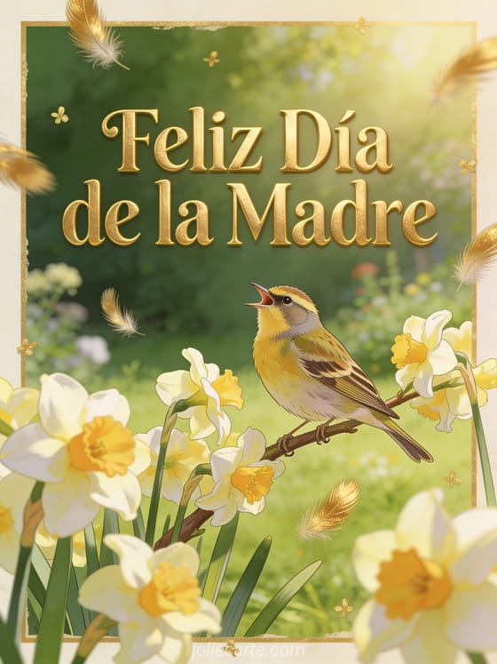 Comparte este jubiloso desear feliz día de la madre con esta tarjeta. Un serín posado en narcisos en flor cantando bajo el sol de primavera con un suave fondo de jardín verde. Descubre también una tarjeta original día de la madre o un día de la madre gif.