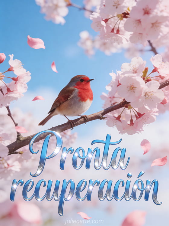 Compartan un mensaje de pronta recuperación con un petirrojo sobre una rama de cerezo en flor y un ambiente luminoso. También pueden descubrir texto pronta recuperación, mensajes de pronta recuperación y corazón ánimo pronta recuperación.