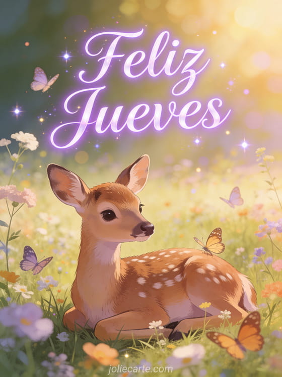 Desea un sereno feliz jueves con esta hermosa tarjeta. Un encantador cervatillo descansa en un campo de flores silvestres con mariposas en una suave escena pastoral llena de paz. Descubre también una tarjeta de mensaje de feliz jueves o una tarjeta de feliz jueves.