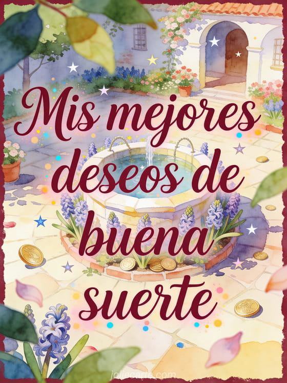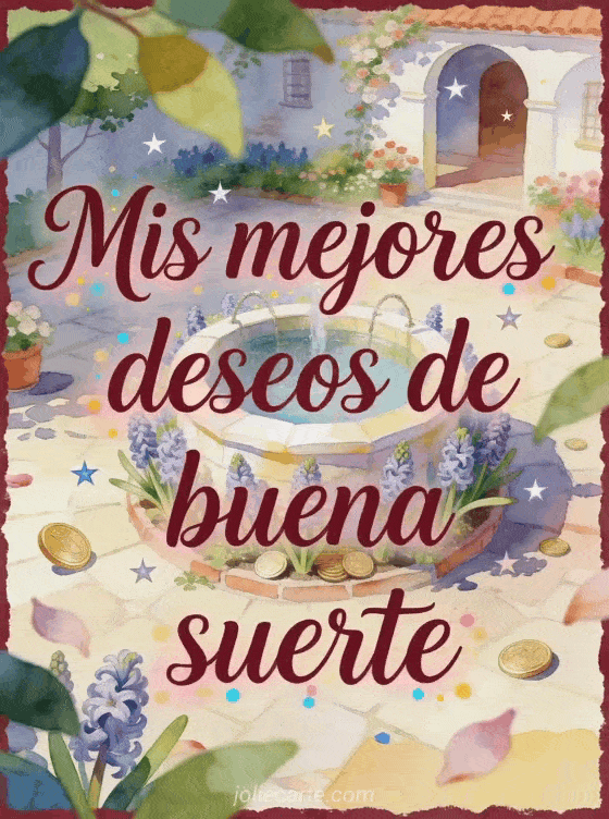Comparte deseos de buena suerte con un pozo de los deseos luminoso rodeado de jacintos, monedas, pequeñas estrellas flotantes y un patio florecido. Descubre también buena suerte imágenes gratis, un texto buena suerte para lo que viene o y sobre todo buena suerte gif.