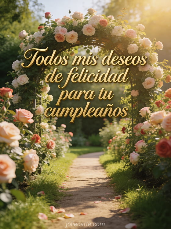Desea lo mejor a una mujer en su cumpleaños con esta preciosa tarjeta con un camino de jardín bordeado de rosales en flor que lleva a un arco floral, bañado por una suave luz dorada de la mañana. Elegante y fotorrealista. Descubre también un gif animado cumpleaños mujer o una tarjeta cumpleaños mujer con perro.