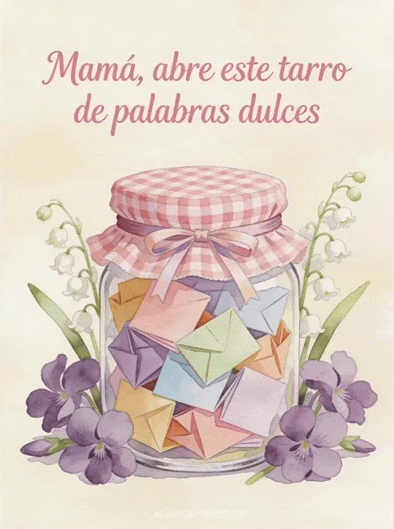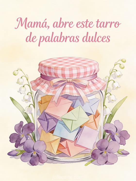 Envía esta tierna tarjeta del día de la madre para regalar un tarro lleno de palabras bonitas. También puedes ver feliz domingo de día de la madre, invitación día de la madre y tarjeta feliz día de la madre.