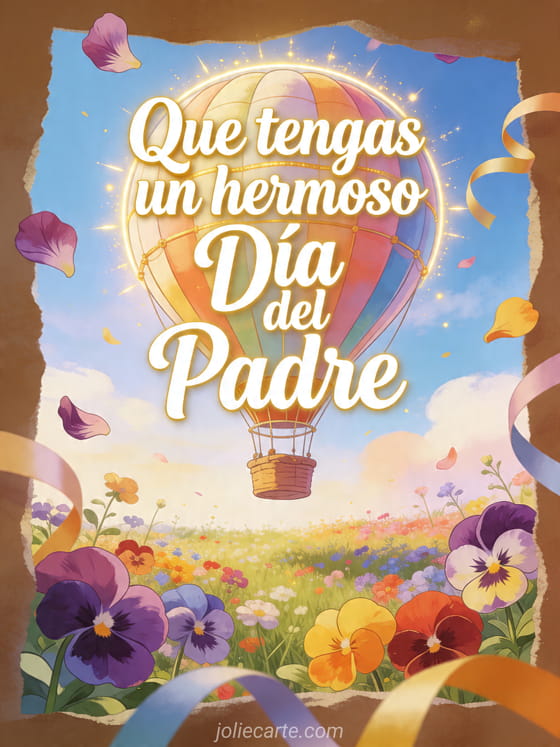 Envíen un saludo alegre de Día del Padre con un globo aerostático ilustrado que flota sobre una pradera colorida llena de pensamientos, cintas y suaves colores luminosos del cielo. Vean también una cita corta Día del Padre, un poema del Día del Padre besos o tarjetas Día del Padre papá.