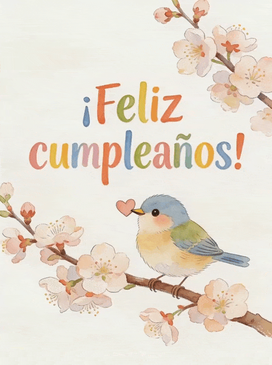 Comparte un hermoso dibujo de cumpleaños con un adorable pajarito posado en una rama de cerezo en flor sosteniendo un pequeño corazón. Descubre también un gif cumpleaños mujer gracioso o una feliz cumpleaños mujer tarjeta virtual para más saludos.