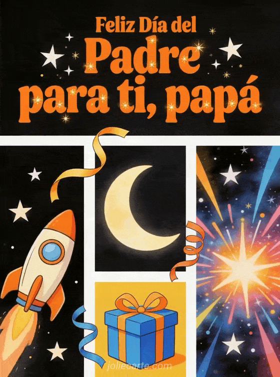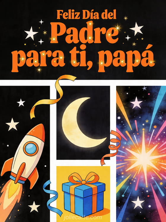 Envía a papá una tarjeta ilustrada y juguetona del Día del Padre con un cohete retro, luna creciente, caja de regalo azul y un cielo estrellado lleno de estallidos de color. Este diseño enérgico es perfecto para un saludo alegre. Descubre también tarjeta Día del Padre papá, tarjeta gratis del Día del Padre o feliz Día del Padre papá imagen.