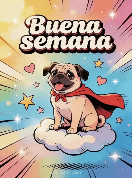 Buena semana un deseo divertido para la semana con un pug superhéroe y mucha energía