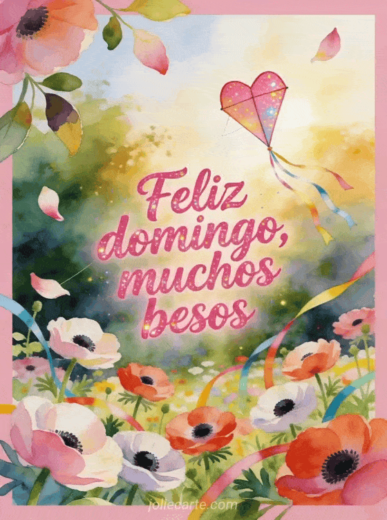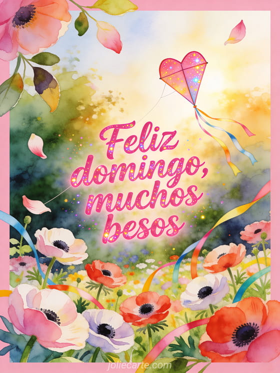 Envía feliz domingo, muchos besos con escritura rosa viva, una cometa en forma de corazón sobre un jardín luminoso de anémonas y cintas de colores. Descubre también feliz domingo religioso gif, tarjetas para desear feliz domingo o feliz domingo lluvioso imagen.