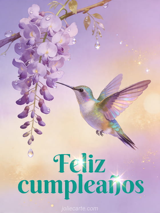Comparte un feliz cumpleaños luminoso con esta delicada tarjeta que muestra un colibrí iridiscente junto a una glicina en cascada. También puedes descubrir una tarjeta animada gratis de cumpleaños flores, una dromedario tarjeta cumpleaños animada gratis musical por sms o una vela cumpleaños gif animado.