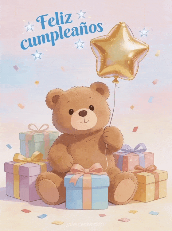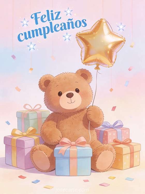 Alegra el cumpleaños de alguien con esta adorable tarjeta con un lindo osito de peluche marrón sosteniendo un globo de estrella dorada, rodeado de regalos coloridos envueltos y confeti cayendo suavemente sobre un fondo pastel. Descubre también una tarjeta de cumpleaños animada gratis o una linda tarjeta animada de feliz cumpleaños.