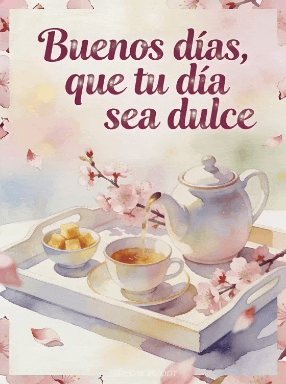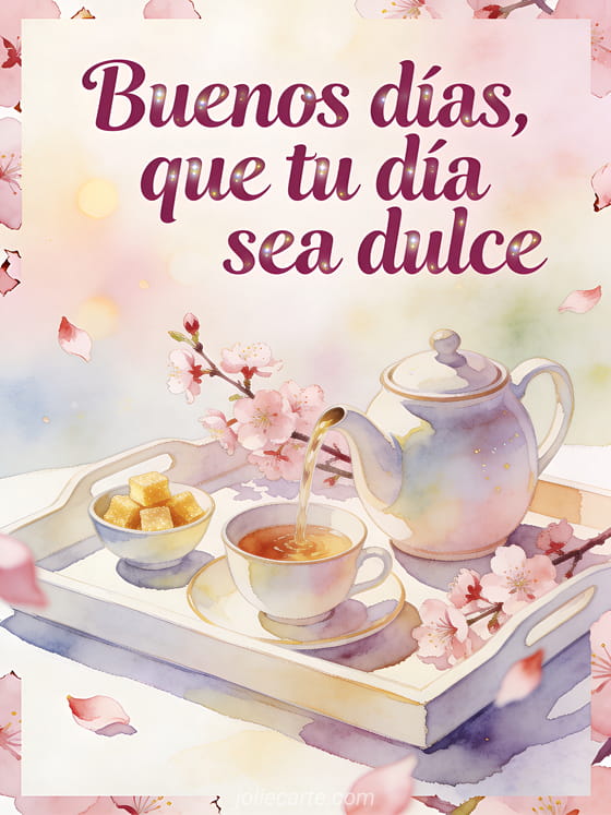 Envía un ejemplo de mensaje de buenos días con letras ciruela suaves en acuarela, una tetera de cerámica, ramas de flor de cerezo, cubos de azúcar dorados y una bandeja luminosa de desayuno. Descubran también mensaje de buenos días conmovedor, mensaje de buenos días matutino o tarjeta virtual animada de buenos días.
