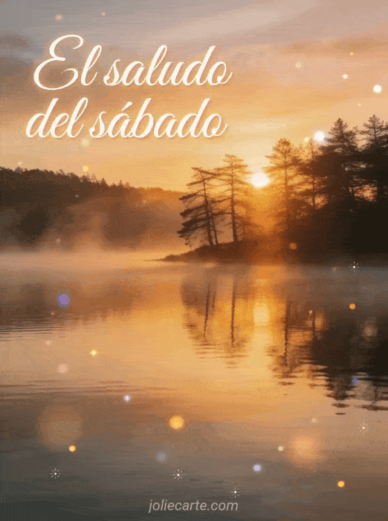 Comparte un saludo contemplativo del sábado con un hermoso amanecer sobre un lago tranquilo, bruma que se eleva y siluetas de árboles reflejadas en el agua. Descubre también un gif romántico de feliz sábado, feliz sábado feliz fin de semana o buenos días feliz sábado gifs animados.