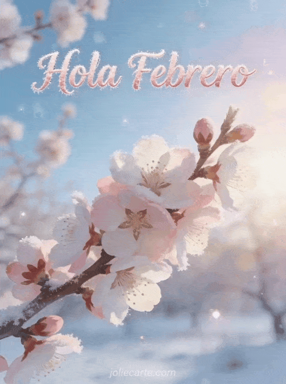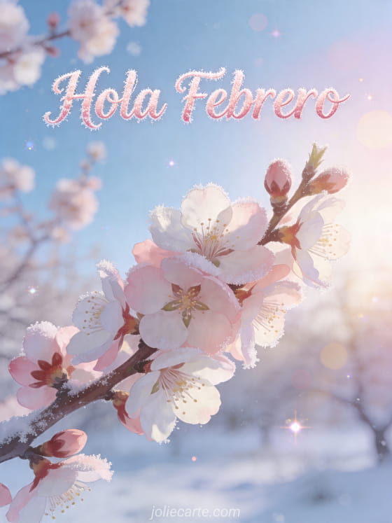 Comparte esta delicada tarjeta de hola febrero con flores de almendro, pétalos rosados y suave luz de invierno. También pueden descubrir hola matinal sms, hola matinal y manda saludos.