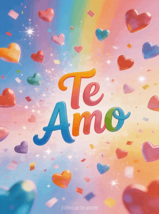 Envía esta alegre tarjeta con una lluvia de corazones coloridos cayendo del cielo sobre un luminoso fondo arcoíris pastel. Descubre también una tarjeta yo también te amo o una tarjeta te amo hasta el infinito.