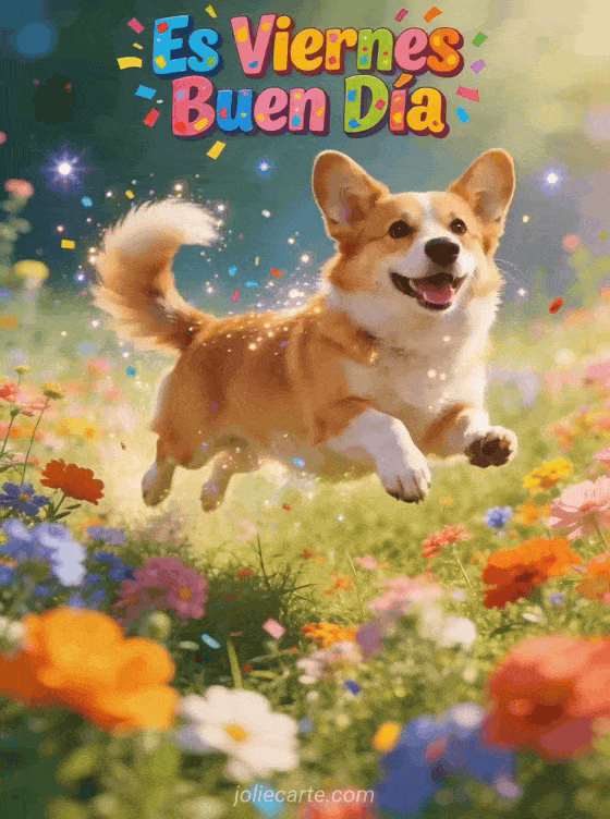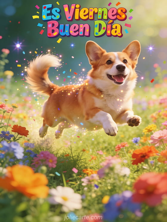 Celebra el fin de semana con esta alegre tarjeta de viernes. Un corgi feliz salta de alegría en un campo de flores silvestres coloridas en una atmósfera festiva de celebración. Descubre también una tarjeta gif divertida de viernes o una tarjeta de buenos días feliz viernes besos.