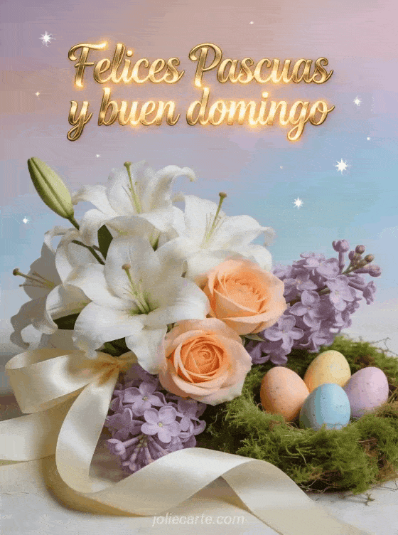 Desee unas felices Pascuas y un buen domingo con esta elegante tarjeta con lirios blancos, rosas durazno y huevos de Pascua en colores pastel. Descubra también una tarjeta de buen fin de semana de Pascua, una tarjeta de feliz domingo de Pascua o una imagen de lunes de Pascua.