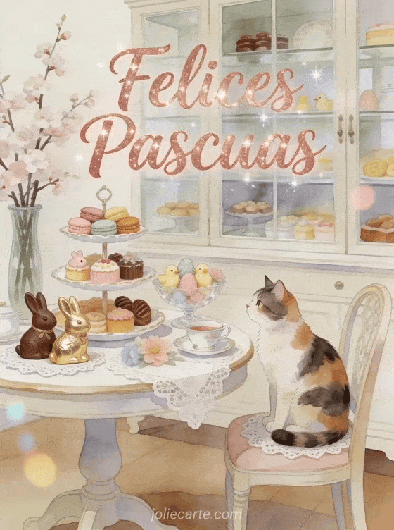 Comparte este alegre gif animado de Pascua con un adorable gato calico, huevos de Pascua y cerezo en flor. Descubre también imagen felices Pascuas gratis o imagen felices Pascuas.