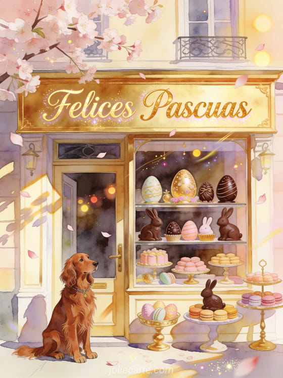 Comparte esta alegre imagen de Pascua con un setter irlandés, huevos de Pascua y flores primaverales. Descubre también gif de Pascua gratis o gifs besos de Pascua.