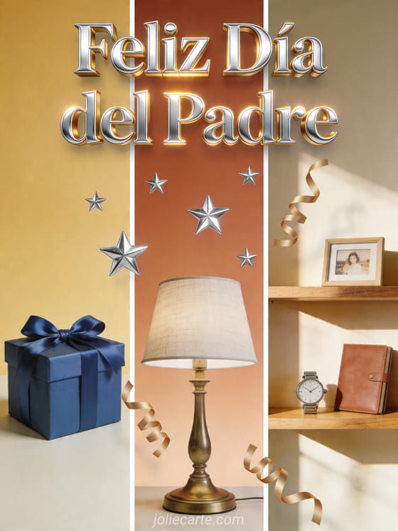 Comparte una tarjeta cálida y realista del Día del Padre con una caja de regalo azul, una lámpara de escritorio clásica y un estante de madera iluminado con pequeños recuerdos, cintas y estrellas. Este diseño elegante es simple, alegre y fácil de enviar. Descubre también tarjeta Día del Padre bebé, tarjeta corazón del Día del Padre o feliz día del padre a mi hijo.