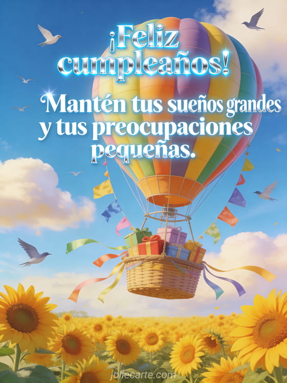 ¡Feliz cumpleaños! Mantén tus sueños grandes y tus preocupaciones pequeñas. una alegre tarjeta de cumpleaños con un globo aerostático sobre campos de girasoles