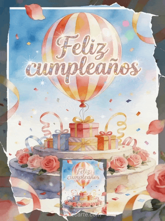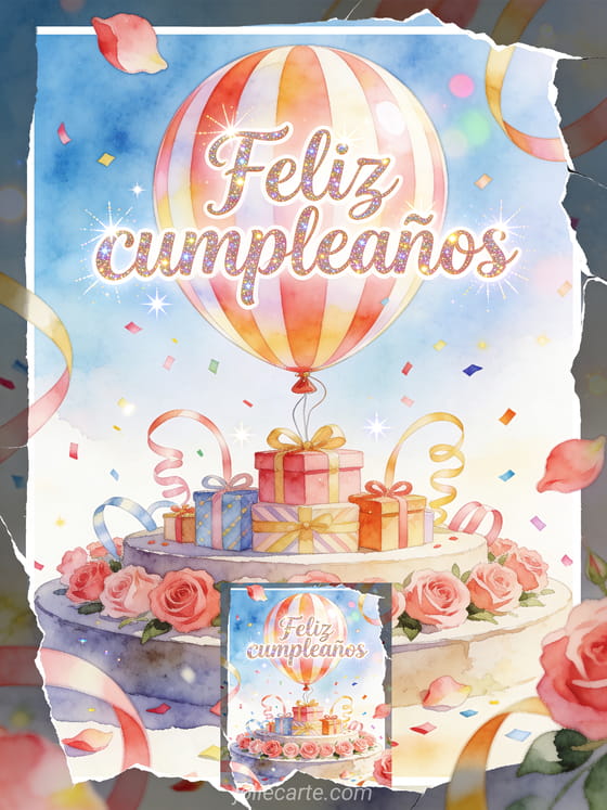 Envíen un saludo festivo de cumpleaños a su hermano con un globo gigante a rayas sobre una terraza de rosas, regalos apilados y confeti brillante. Descubran también feliz cumpleaños a su hermano mayor sms, feliz cumpleaños mi hermanito sms o cumpleaños hermano.