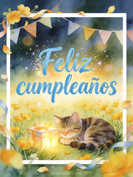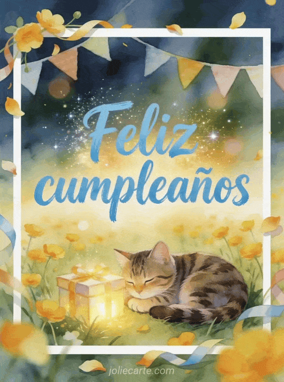 Envía a tu nieta una dulce tarjeta de feliz cumpleaños con un gato atigrado acurrucado junto a una caja de regalo luminosa en una alegre pradera de ranúnculos. También pueden gustarte una cumpleaños para mi nieta o una feliz cumpleaños nieta imagen para celebrar con cariño.
