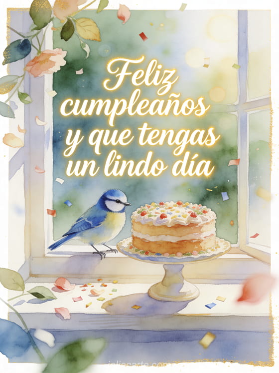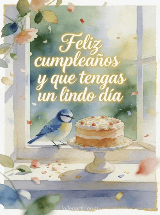 Envía una tarjeta feliz cumpleaños a papá con caligrafía crema elegante, un herrerillo posado junto a un pastel decorado en un presentador sobre una ventana luminosa, pétalos, hojas y confeti sobre el borde. Descubre también feliz cumpleaños mi papá, feliz cumpleaños papá amor o un poema feliz cumpleaños suegro.