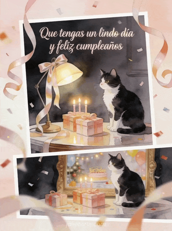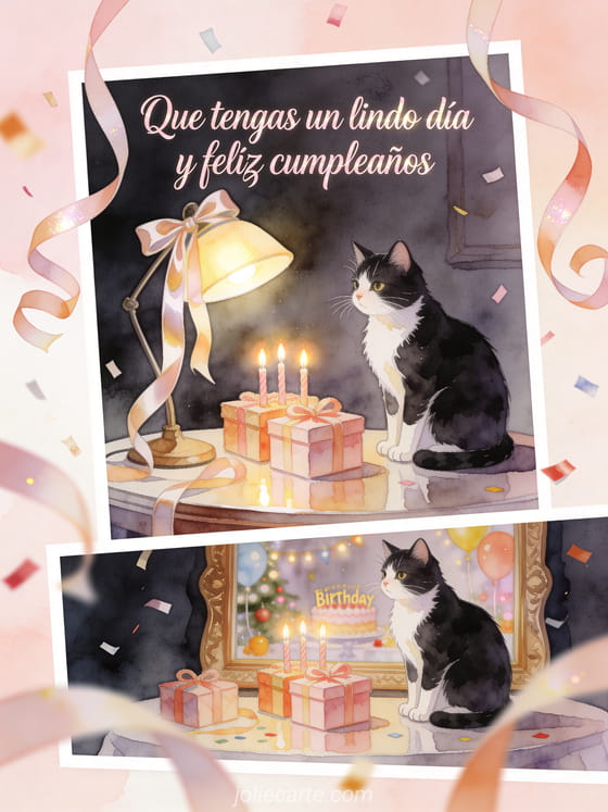 Envía un saludo elegante de cumpleaños con un gato blanco y negro en acuarela, una lámpara de escritorio iluminada, cintas de satén, regalos y velas de cumpleaños. También pueden compartir una mensaje de cumpleaños colega de trabajo, una feliz cumpleaños de una compañera de trabajo o una feliz cumpleaños mi compañero de trabajo.