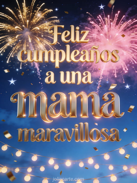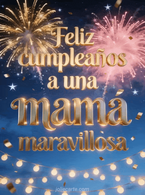 Celebra a una mamá maravillosa con letras doradas cálidas, un espectáculo de fuegos artificiales dorados y rosas en un cielo nocturno azul profundo, estrellas brillantes, confeti dorado y guirnaldas luminosas. También pueden enviar un feliz cumpleaños mamá animado, una feliz cumpleaños mamá tarjeta o una feliz cumpleaños tarjeta para una mamá joven.