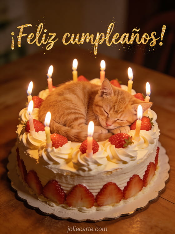 Una tierna tarjeta con un gatito naranja dormido encima de un pastel de cumpleaños con velas y fresas. Descubre también una tarjeta feliz cumpleaños adolescentes, una imagen cumpleaños adolescente chico o una tarjeta cumpleanos adolescente chica.