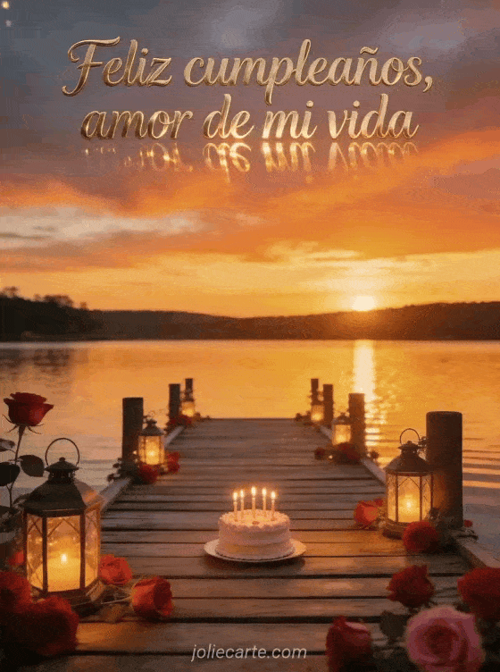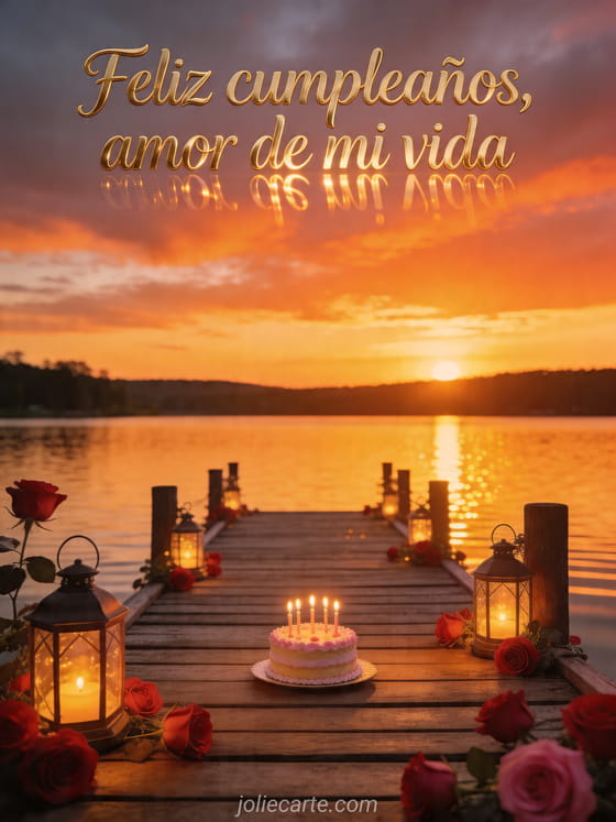 Celebra tu amor con esta tarjeta fotorrealista de cumpleaños que muestra un atardecer brillante sobre un lago, un muelle con rosas y un pequeño pastel con velas. También puedes descubrir tarjeta cumpleaños pareja, feliz cumpleaños mi corazón o feliz cumpleaños mi amor texto conmovedor a distancia.