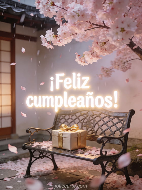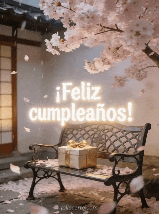 Envía esta tarjeta animada de feliz cumpleaños gratis con un cerezo en flor con lluvia de pétalos y un regalo sobre un banco de hierro forjado. Descubre también una tarjeta animada gratuita musical de cumpleaños o un cumpleaños gif animado.