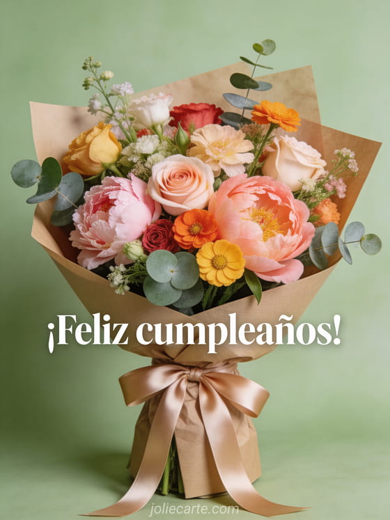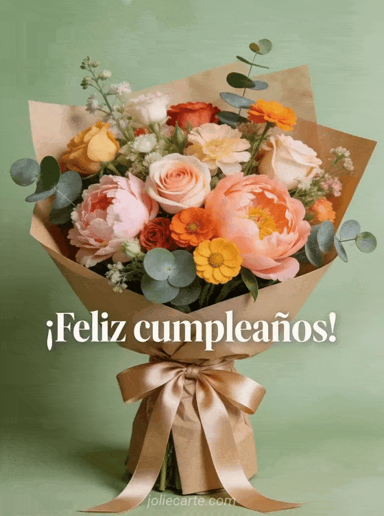 Envía esta preciosa tarjeta de cumpleaños animada con un lujoso ramo de peonías, rosas y ranúnculos envuelto en papel kraft. Descubre también las e-cards de cumpleaños animadas gratis o la tarjeta de cumpleaños con gato gif animado gratis.