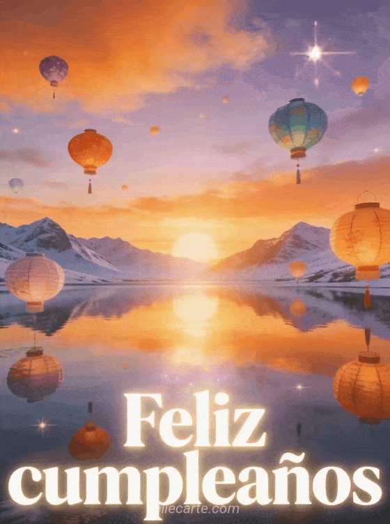 feliz cumpleaños animado Un saludo de cumpleaños mágico y sereno con reflejos de amanecer en la montaña.