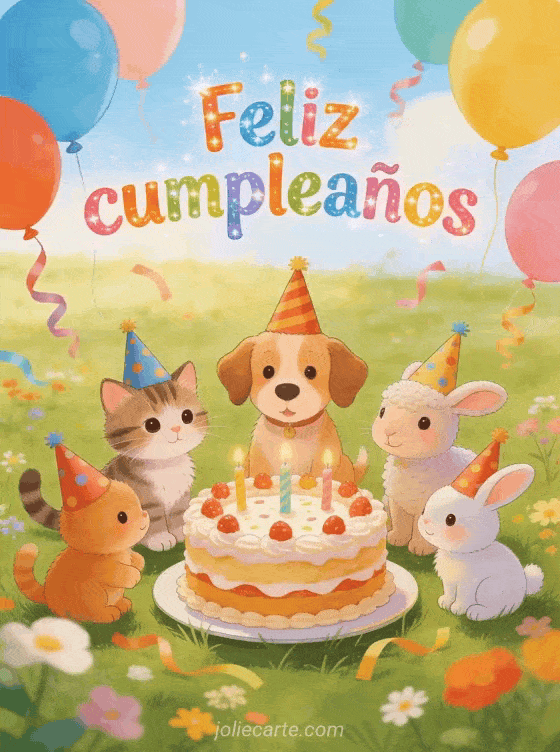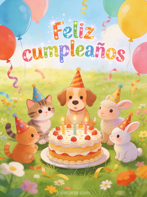 Compartan una tarjeta cálida con estilo de libro infantil, con un gatito, un perrito y un conejito reunidos alrededor de un pastel, todos con pequeños gorros de fiesta. Globos coloridos, serpentinas, flores silvestres y una pradera soleada hacen que el saludo sea brillante y alegre. Descubran también texto cumpleaños bebé niño 1 año, bebé desea feliz cumpleaños o feliz cumpleaños mi bebé 2 años.