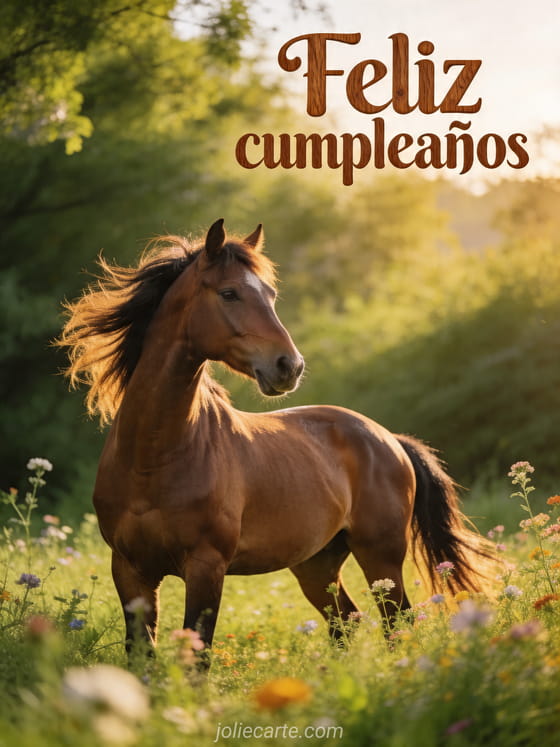 Comparte un cálido mensaje de cumpleaños con esta tarjeta majestuosa de un caballo café en un prado verde. Descubre también feliz cumpleaños amigo mío, feliz cumpleaños mujer gif y frase feliz cumpleaños.