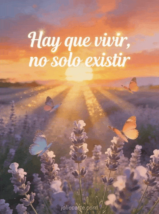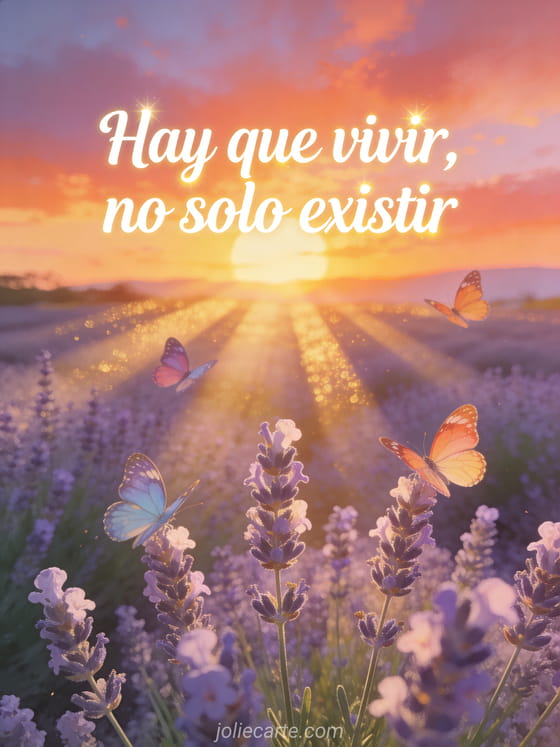 Regalen un mensaje de cumpleaños reflexivo con esta ilustración poética de atardecer sobre lavanda, rayos dorados y mariposas coloridas. También pueden descubrir frase sobre los años que pasan cumpleaños, cita para mi cumpleaños y pensamientos positivos frase optimista cumpleaños.