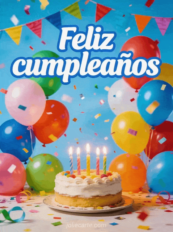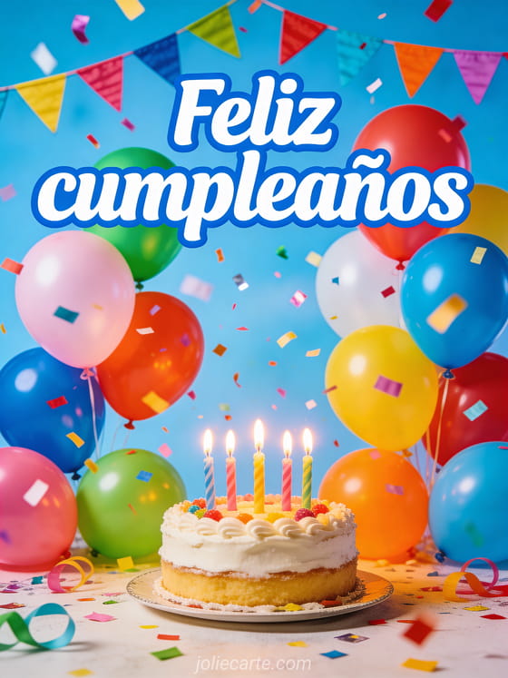 Comparte esta vibrante tarjeta de feliz cumpleaños en Facebook con globos coloridos y confeti festivo. Descubre también una tarjeta feliz cumpleaños que este año sea o una tarjeta desear feliz cumpleaños.