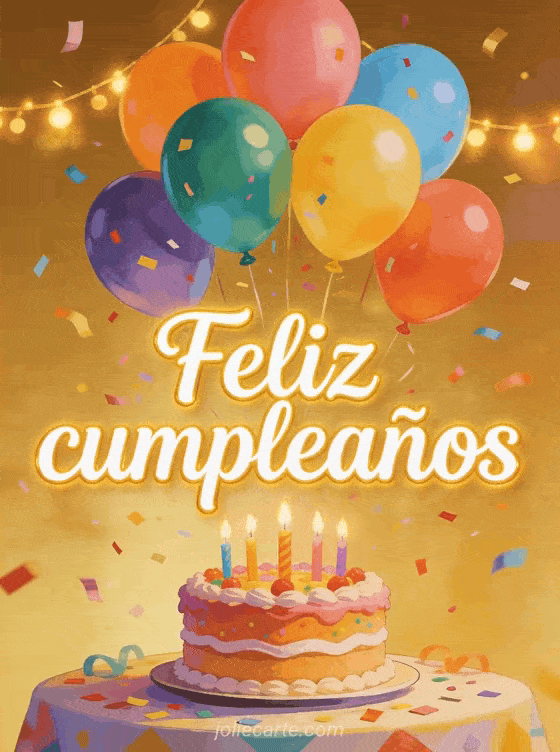 Celebra con una tarjeta de feliz cumpleaños llena de pastel colorido, velas, globos y confeti volando en luz dorada cálida. Descubre también sms para desear feliz cumpleaños, feliz cumpleaños chocolate y feliz cumpleaños copa de champán.