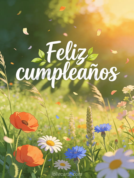 Celebra con una tarjeta de feliz cumpleaños flores naturaleza con amapolas, margaritas y encanto campestre al atardecer. Descubre también feliz cumpleaños con mascarilla coronavirus, sms para desear feliz cumpleaños y feliz cumpleaños gato imagen.