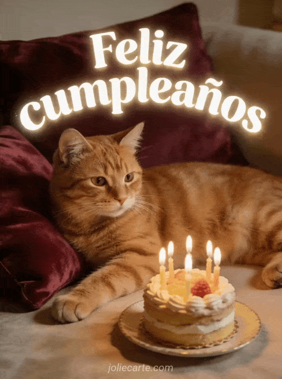 Comparte un cálido feliz cumpleaños con esta tarjeta fotorrealista que muestra un elegante gato naranja sobre un cojín de terciopelo junto a un pequeño pastel con luz suave. También puedes descubrir desearle feliz cumpleaños, feliz cumpleaños mejor amiga o flor mujer feliz cumpleaños flores.