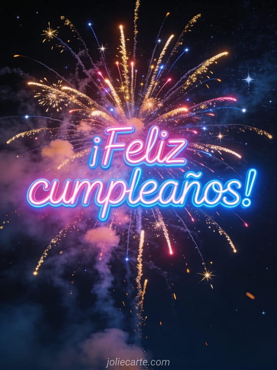 Envía este espectacular gif animado de feliz cumpleaños con luces de neón y fuegos artificiales multicolores en el cielo nocturno. Descubre también una feliz cumpleaños imagen animada o una tarjeta cumpleaños gif animado gratis.
