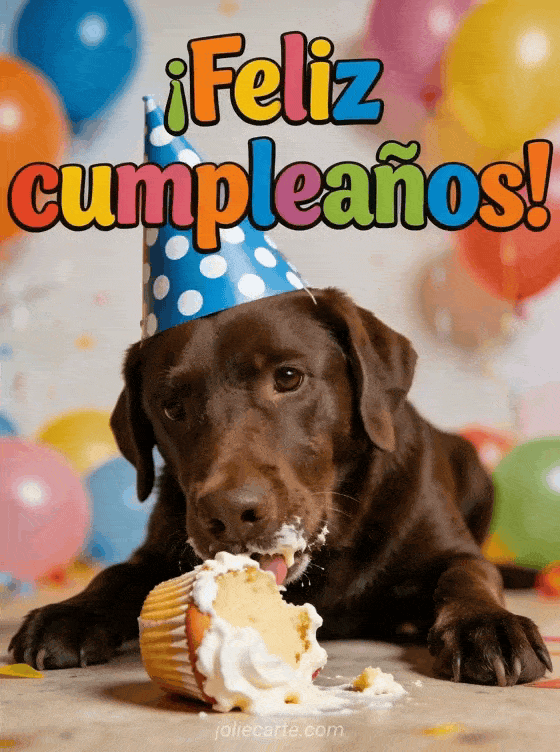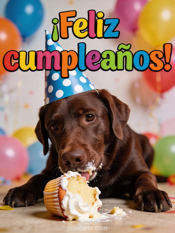 Envía una adorable tarjeta graciosa de feliz cumpleaños para una mujer con un labrador chocolate y su cupcake. Descubre también una imagen feliz cumpleaños mujer o un gif feliz cumpleaños mujer.