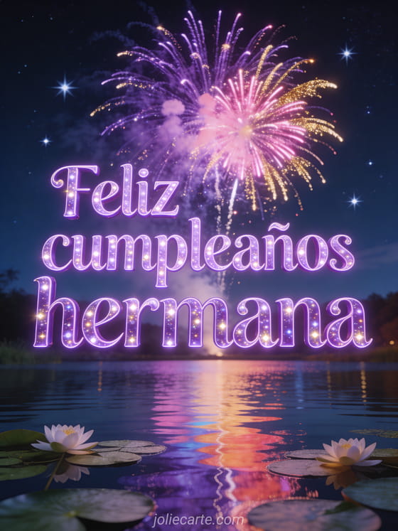 Celebra el cumpleaños de tu hermana con esta espectacular tarjeta gratuita. Fuegos artificiales violetas, rosas y dorados sobre un lago con reflejos coloridos y estrellas centelleantes. Descubre también una tarjeta de cumpleaños hermana divertida o una tarjeta de cumpleaños hermana o una tarjeta de cumpleaños para hermana.