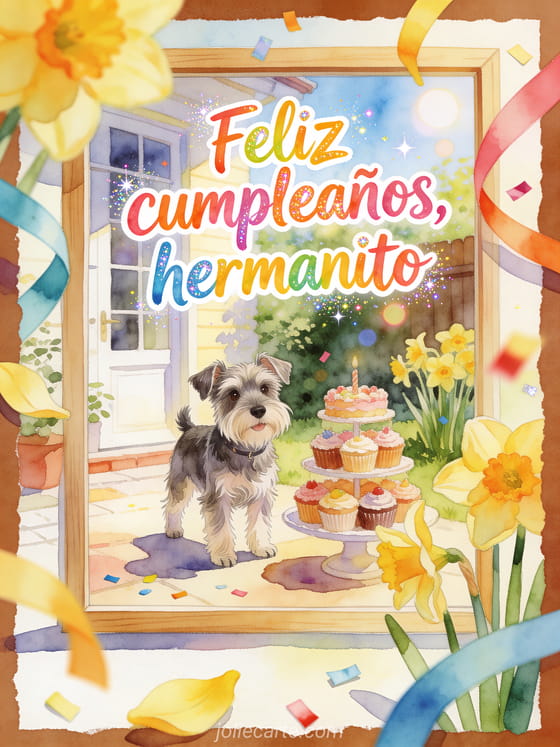Envíen un saludo colorido de cumpleaños a su hermanito con un schnauzer miniatura en un patio soleado, una torre de cupcakes, narcisos y cintas brillantes. Descubran también feliz cumpleaños a su hermano mayor sms, mi hermano feliz cumpleaños hermano humor o cumpleaños mi hermano.