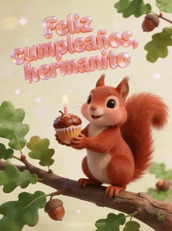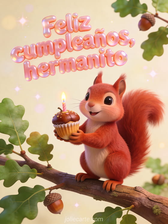 Envía una tarjeta juguetona de cumpleaños con una ardilla roja que sostiene una avellana decorada como un mini cupcake, posada en una rama de roble. También pueden compartir una cumpleaños hermanito, una cumpleaños hermano o una feliz cumpleaños mi hermano mayor.
