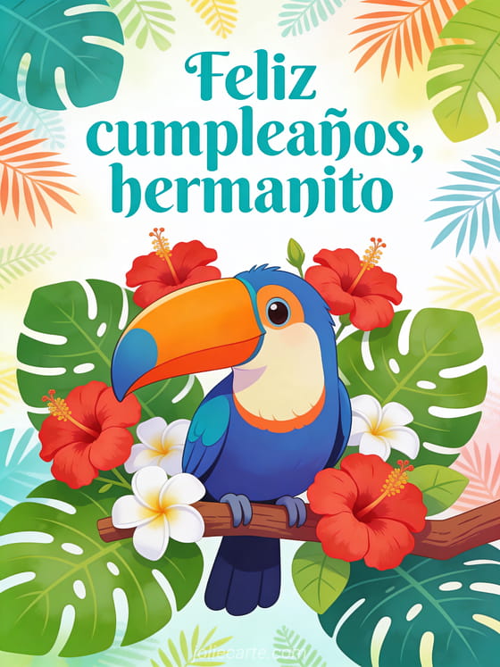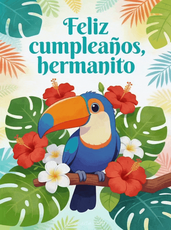 Celebra a tu hermanito con un tucán colorido posado en una rama tropical, rodeado de hibiscos rojos, frangipani blancos y hojas gigantes de monstera. También pueden compartir una cumpleaños mi hermano, una feliz cumpleaños mi hermano gif o una hermanito feliz cumpleaños mi hermano gif.