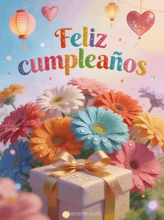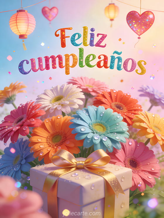 Comparte una tarjeta colorida de cumpleaños con gerberas multicolores, gotas de agua brillantes, linternas de fiesta y un regalo envuelto con cinta en primer plano. También pueden enviar una feliz cumpleaños mi hermanito gif, una tarjeta de cumpleaños para un hermano o una hermanito feliz cumpleaños mi hermano gif.