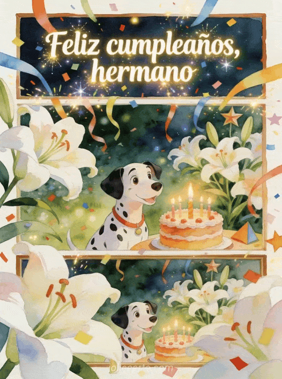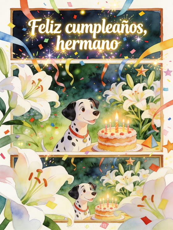 Envíen un saludo de cumpleaños lleno de alegría a su hermano, con un dálmata juguetón, confeti brillante y un pastel con velas. Descubran también feliz cumpleaños a su hermano mayor sms, feliz cumpleaños mi hermanito sms o feliz cumpleaños hermanito imagen.