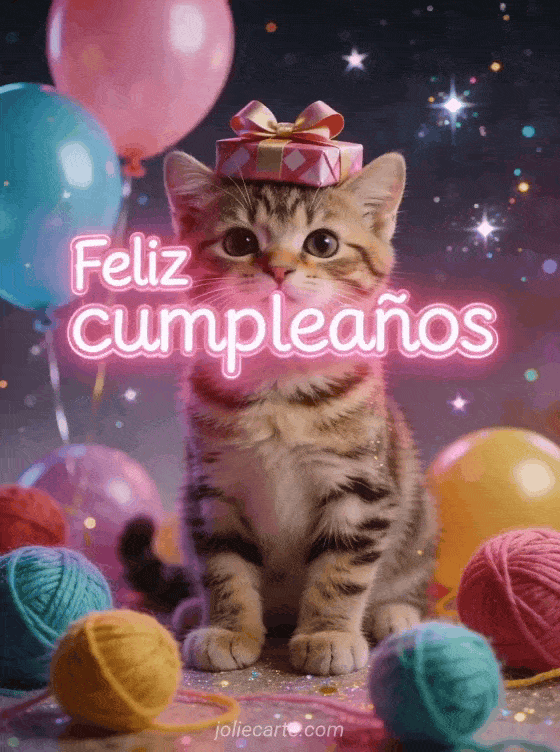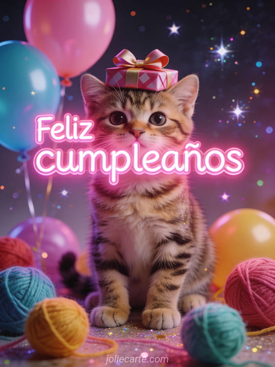 Comparte una tarjeta juguetona de cumpleaños con un gatito atigrado que lleva un moño de regalo en la cabeza, rodeado de ovillos de lana coloridos y globos sobre un fondo suave y brillante. También pueden enviar una feliz cumpleaños hermanito, una cumpleaños mi hermano o una feliz cumpleaños mi hermano gif.